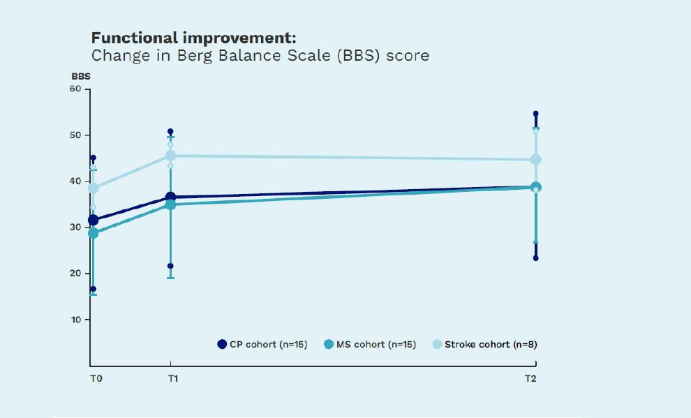 Η πρώτη μελέτη βασίζεται στην αλλαγή της κλίμακας ισορροπίας Berg (BBS) – 38 ασθενείς (που έπασχαν από τρεις κύριες ασθένειες: Σκλήρυνση κατά πλάκας, εγκεφαλική παράλυση και εγκεφαλικό) με διαταραχή της ισορροπίας και αυξημένο κίνδυνο πτώσης εξετάστηκαν σε ένα τεστ 20 λεπτών με 14 σύντομες ασκήσεις ισορροπίας. Βλέπουμε τρία σημεία στο χρονοδιάγραμμα. – Η T0 δείχνει την αρχική τιμή, το Τ1 δείχνει το αποτέλεσμα μετά από 1 ώρα διέγερσης και το Τ2 δείχνει το αποτέλεσμα μετά από συνεχόμενη χρήση 4 εβδομάδων κάθε δεύτερη μέρα. Το αποτέλεσμα έδειξε ότι μόνο μετά από μια ώρα διέγερσης, οι ασθενείς ήταν ήδη σε θέση να κινούνται πιο ελεύθερα και με ασφάλεια. Μετά από τέσσερις εβδομάδες τακτικής χρήσης κάθε 2η ημέρα, η βελτίωση παρέμεινε.
